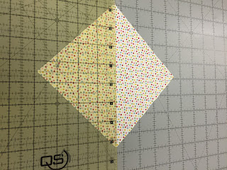 Cut the background squares 5.5" square--you need 6 of these. Cut each in half on the diagonal, then carefully move the ruler and cut the other diagonal, creating 4 Quarter Square Triangles.